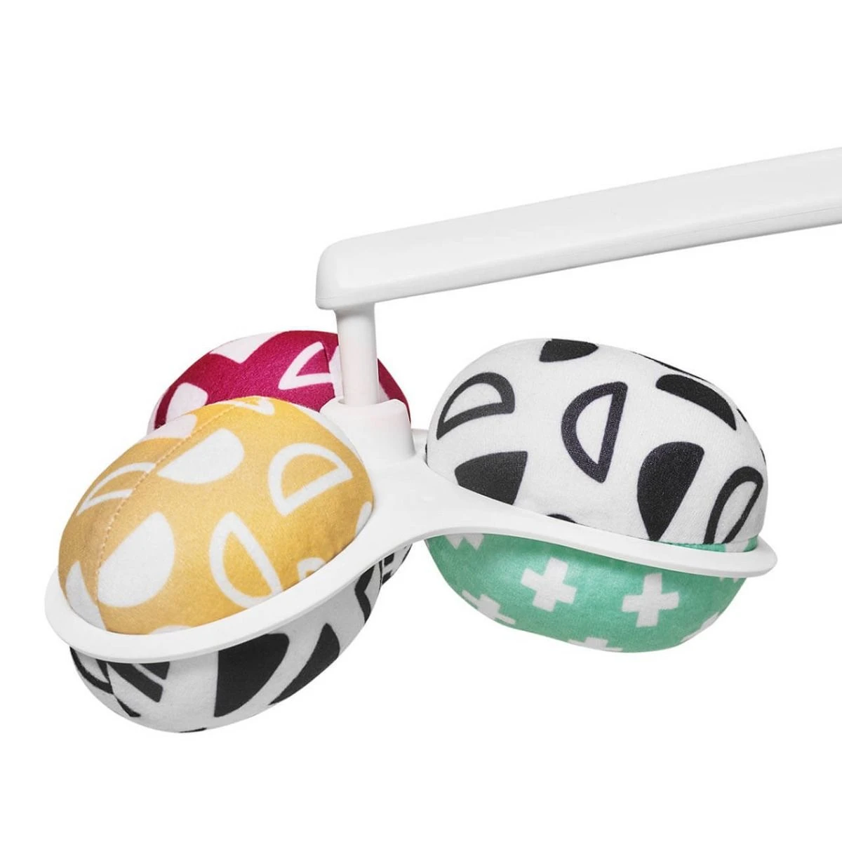 Toy mobile with interactive, reversible toy balls that include a rattle, mirror and crinkle ball