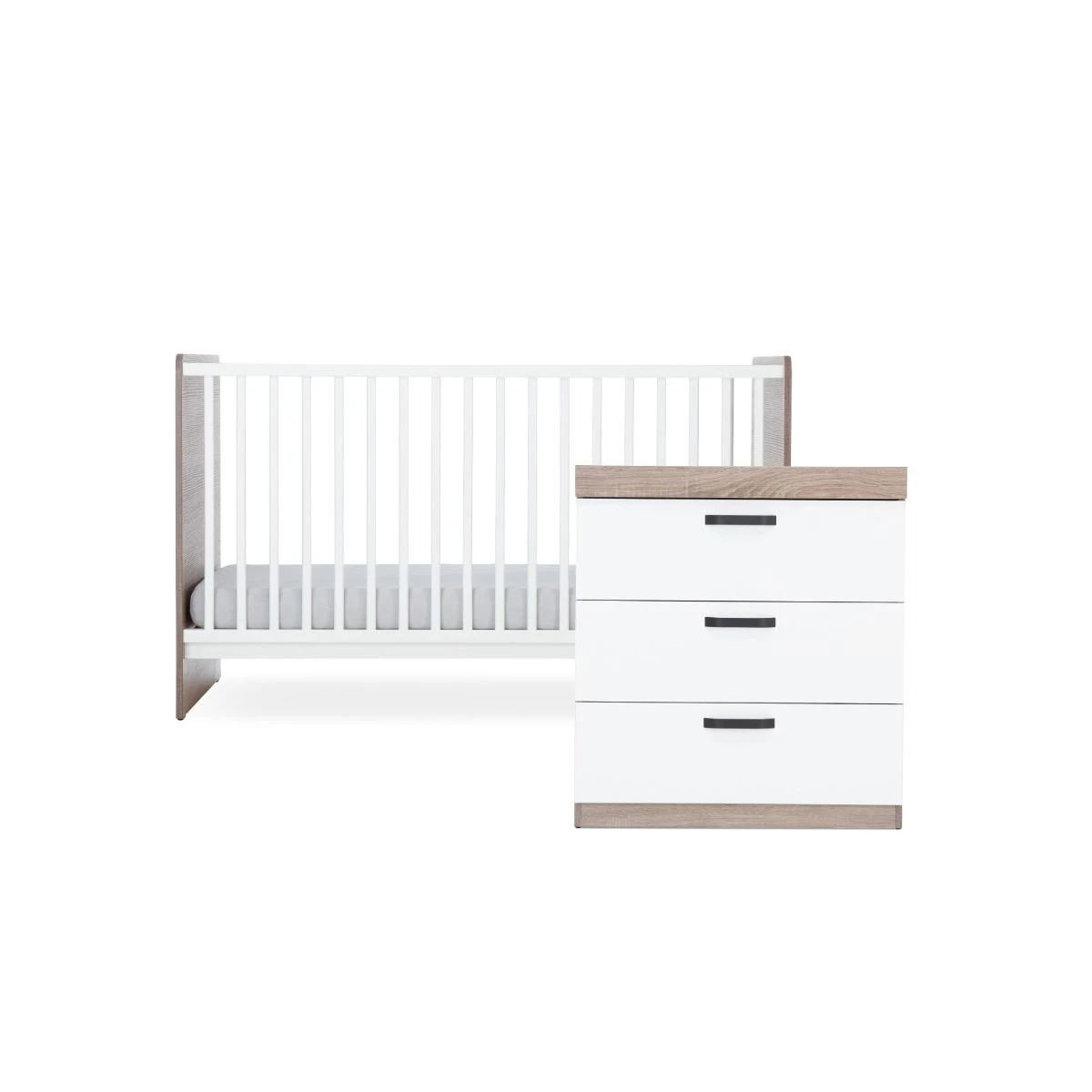 The Enzo 2 Piece Nursery Furniture Set pairs an understated style with a neutral colour palette, combining cool white with a Truffle Oak wood finish. These muted tones are perfect for creating a laidback, calming environment for your baby.