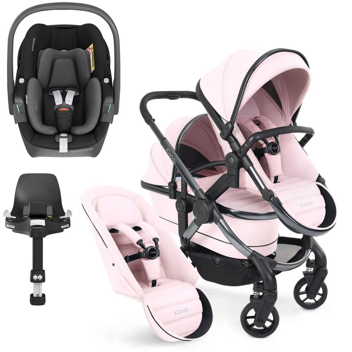 ICandy Peach 7 Double Pushchair Travel System Bundle With Maxi-Cosi Pebble 360 ISize Car Seat & Base – Blush