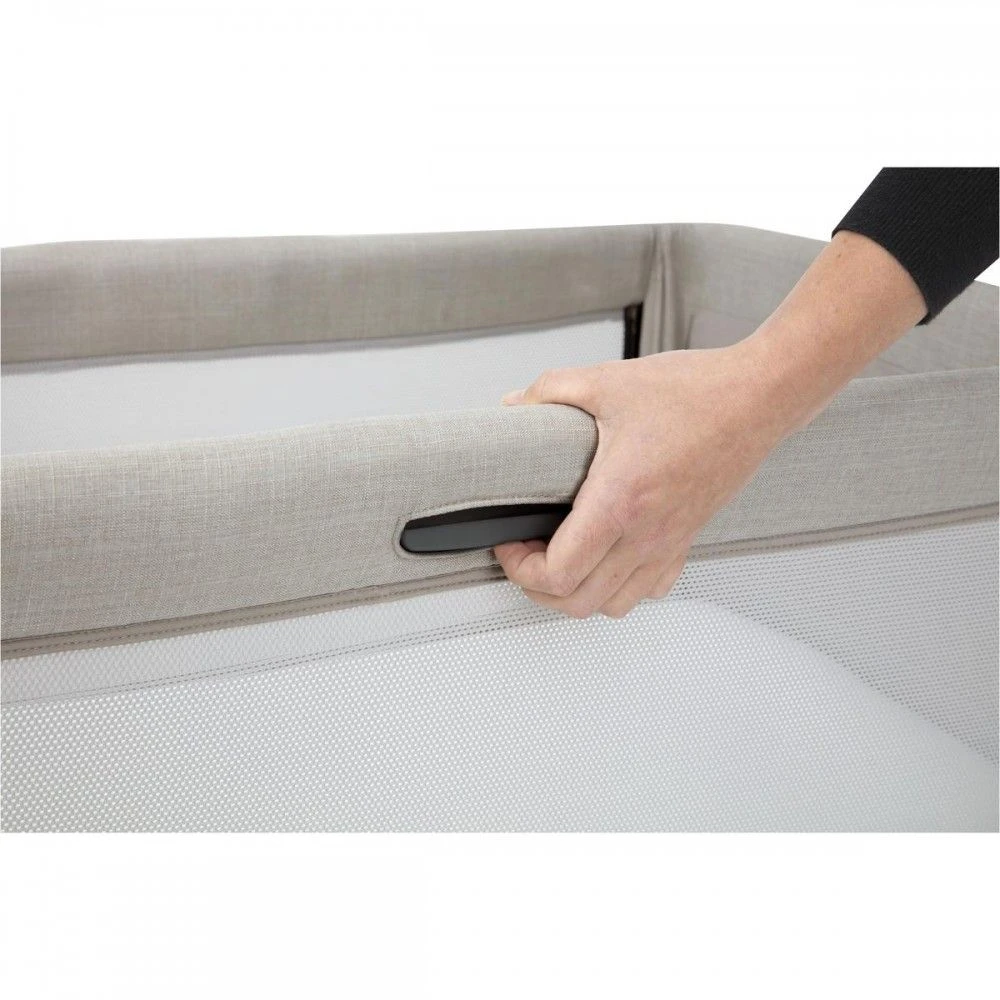 Lift and lower the sliding side panel just one hand for easy access to your little one