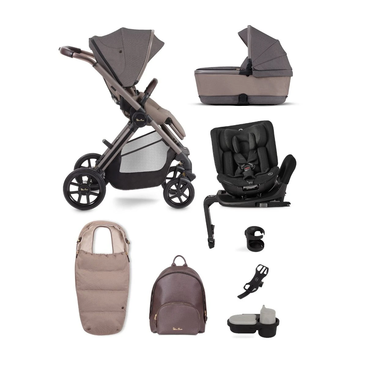 The Reef Ultimate Pack bundle includes Reef, a First Bed Folding Carrycot, a Motion All Size 360, cup holder, matching footmuff, vegan leather changing backpack, phone holder and snack tray.